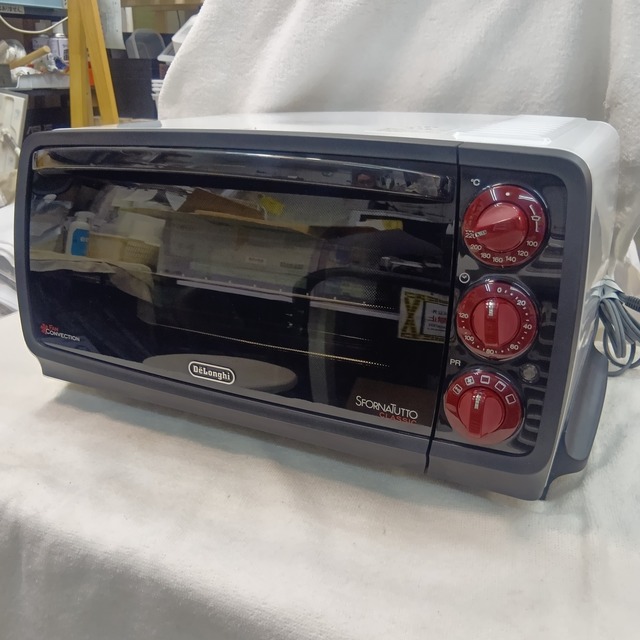 ◆商品案内◆ デロンギ コンベクションオーブン SFORNATUTTO CLASSICです。 上下のヒーターとファンで中までしっかり、表面はカリッと 仕上げてくれるコンベクションオーブン。 オーブン専用なので予熱時間が短く立ち上がりが早いです。 複雑な設定いらずの簡単ダイアル式。 オイルラック付きで余分な油を落としてヘルシー調理。 グラタン皿はもちろん、お鍋もそのまま入る広々庫内。 白黒ボディに赤いダイヤルのデザインがデロンギらしく とてもおしゃれでキッチンがスタイリッシュに。 高級オーブンをこの価格で。 今なら表示価格からさらにお値引きしちゃってますよ。 お見逃しなく! *付属品であるはずのピザストーンがありません。 外寸サイズ 幅約48㎝ 奥約36㎝ 高約24㎝