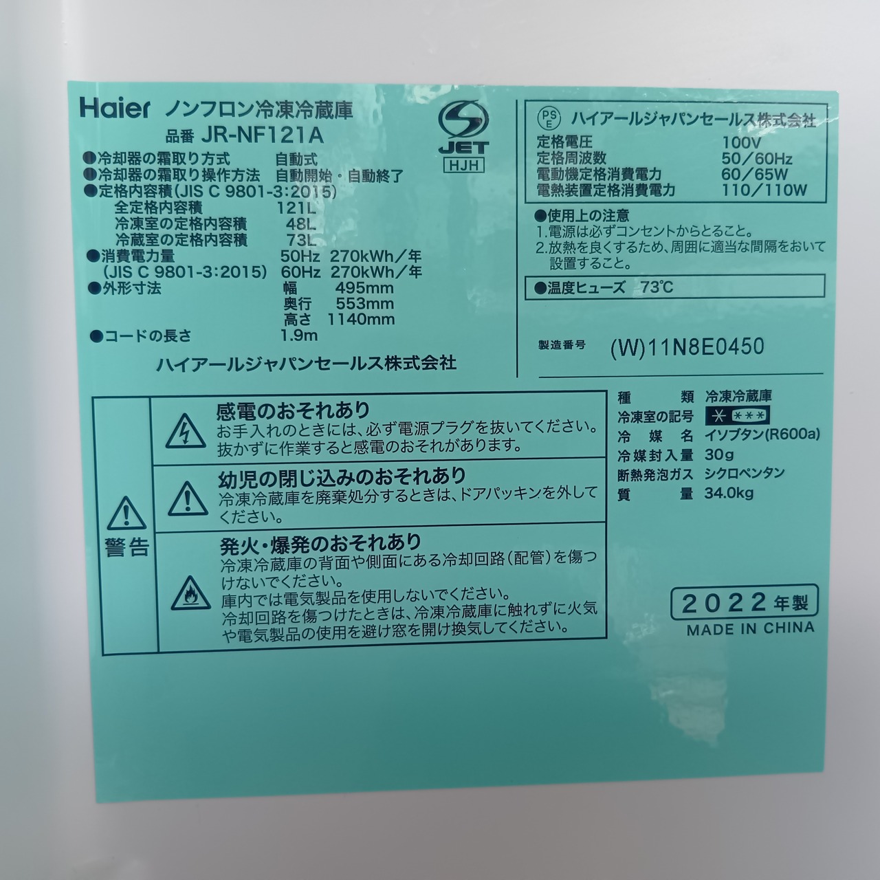 Haier 2022年製品 121L 2ドア冷蔵庫です。