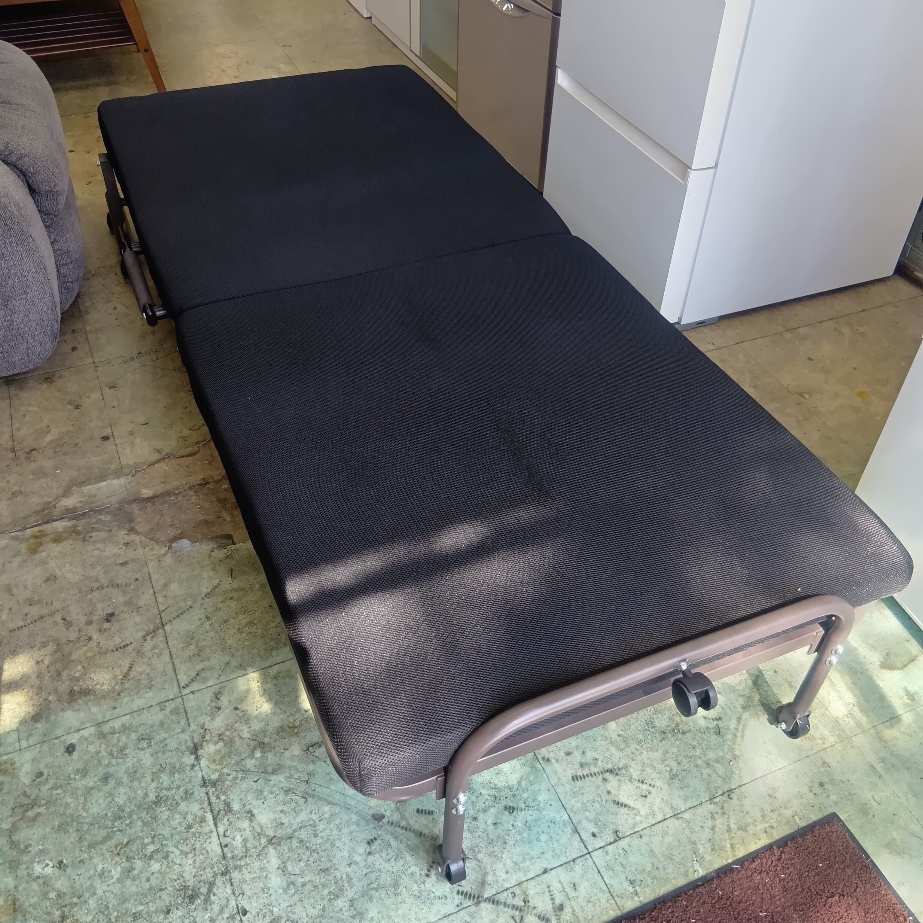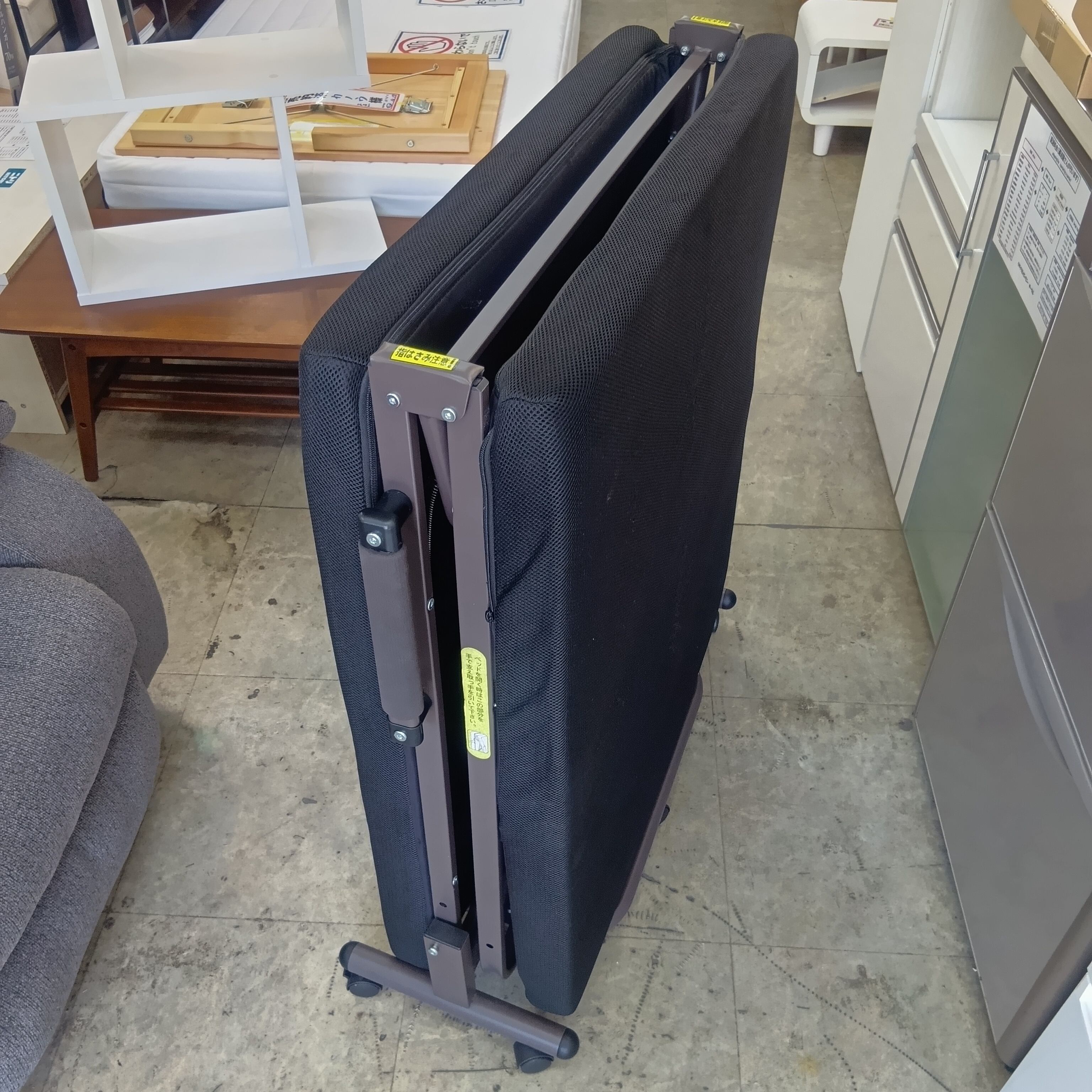 ダークブラウンカラーのメタルフレームに黒いマットレス。