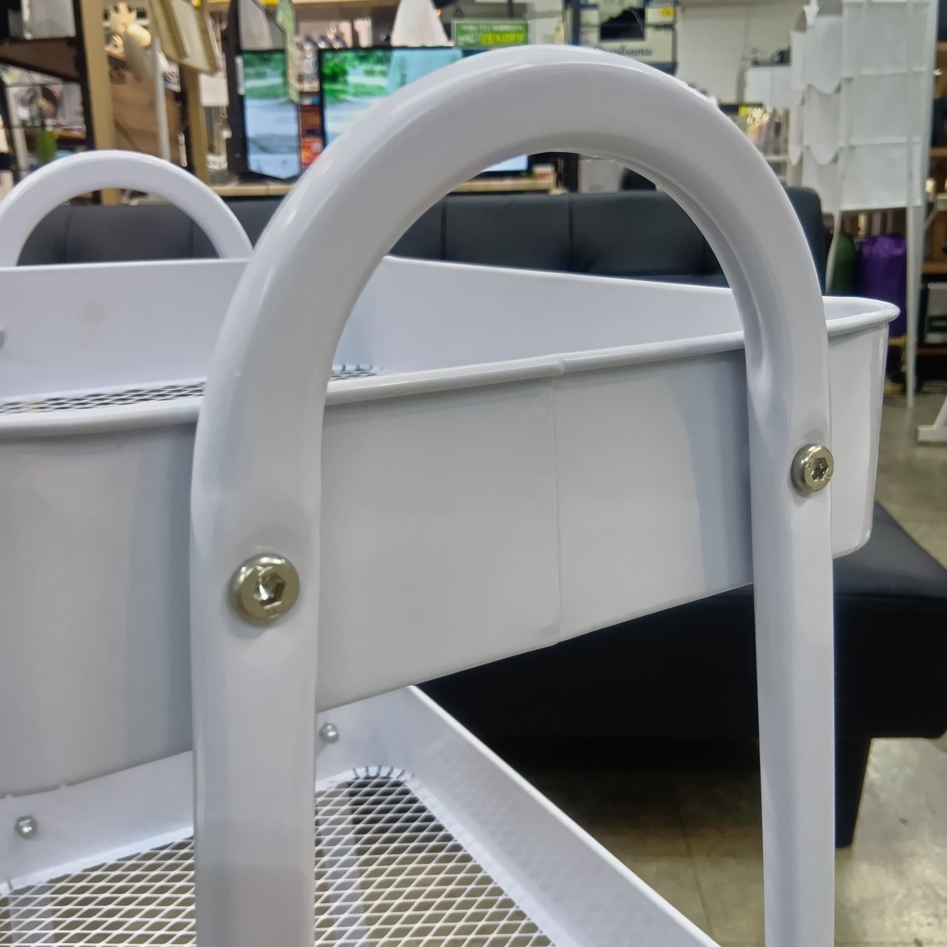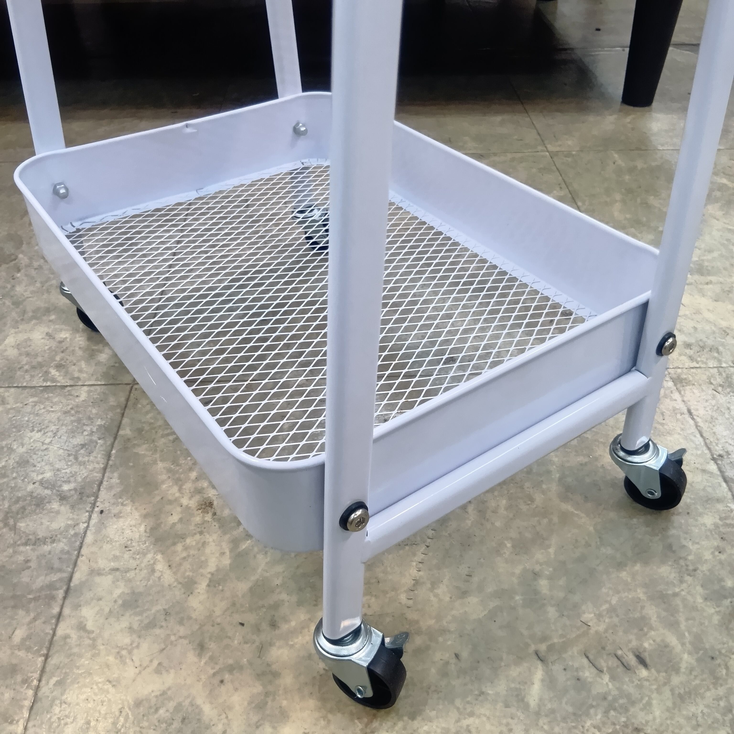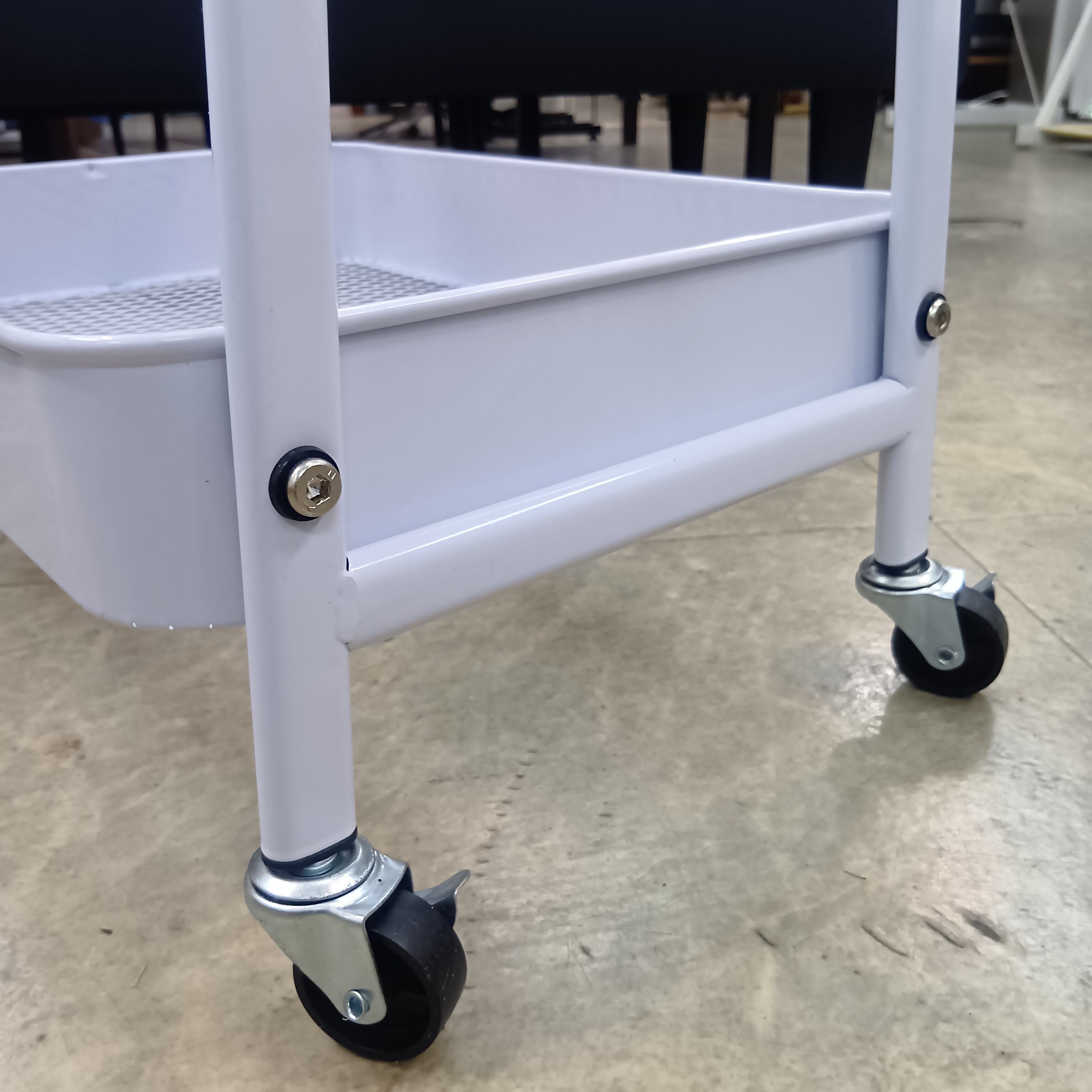スチール製の白い3段のワゴンです。