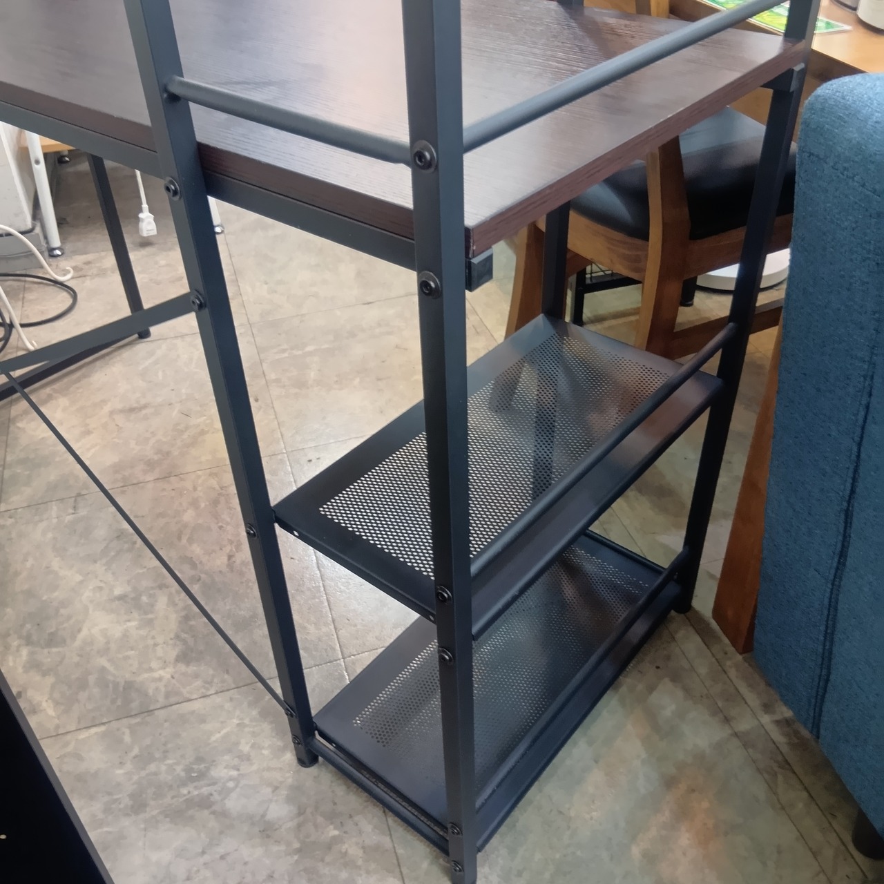 広々デスクのサイドには棚が付いているので